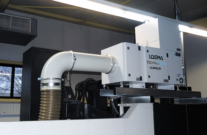 Après étude, le spécialiste a distingué 3 étapes d’épuration de l’air : la préfiltration qui stoppe les microparticules légères (petits copeaux, poussières…), la filtration coalescente qui traite le brouillard d’huile (le biofiltre à champ profond Losma éliminant le risque de colmatage progressif, ce système permet la récupération du fluide de coupe et sa réintégration dans le réseau de la machine), et enfin, le filtre absolu H 13 qui capte toutes fumées et micro-brouillards résiduels avec un rendement supérieur à 99,95 %. Cette étape est incontournable pour l’usinage finition de matières réfractaires qui disperse dans l’air des microparticules dangereuses pour la santé. À l’examen des implantations machines, il était difficile d’envisager une installation au sol. En conséquence, Christian Strippoli a orienté son client vers les modèles Icarus de Losma. Ceux-ci sont positionnables sur la partie supérieure de la machine.
