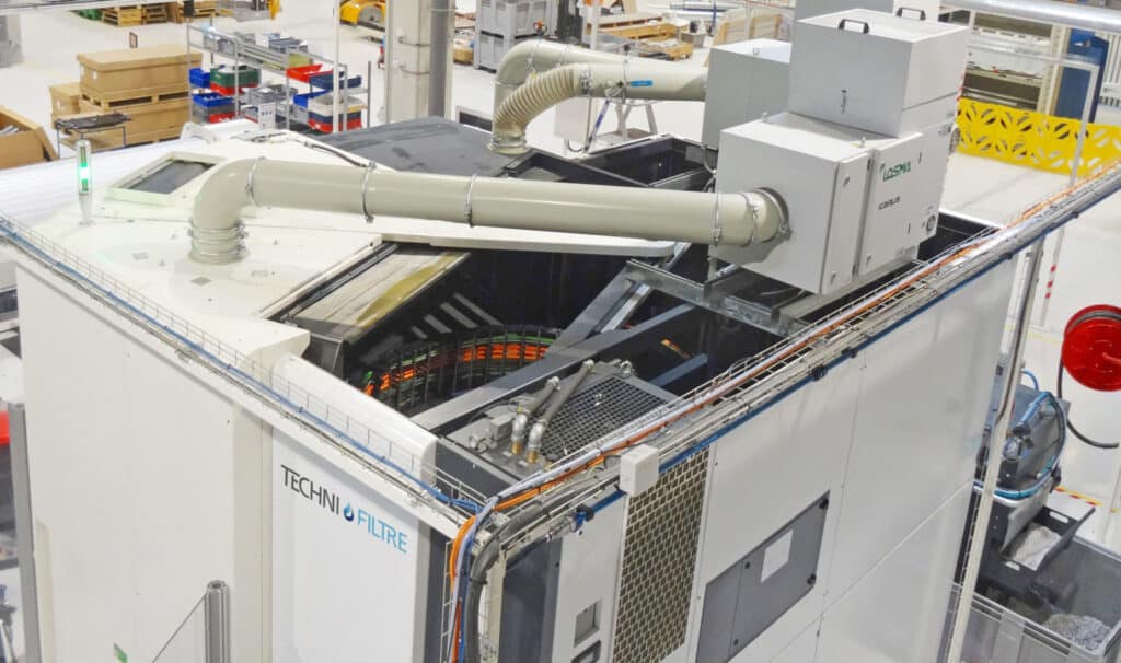 Constatant la sous-capacité des systèmes d’aspiration-filtration standard des 6 cellules 5 axes Mazak robotisées, l’équipe a ouvert un chantier d’amélioration sur le sujet. L’encrassement rapide des filtres des équipements d’aspiration de brouillards d’huiles exigeait une maintenance fréquente. Appelé à la rescousse sur le conseil du fabricant de la machine, Technifiltre, distributeur français d’équipements LOSMA, a proposé l’adjonction, sur l’unité de filtration Galiléo Losma, d’un préfiltre facilement intégrable. Le système d’aspiration Galiléo combine la double technologie de filtration statique et dynamique. L’accumulation des contraintes du process à fort débit d’enlèvement de copeaux dépassait largement les possibilités d’un équipement standard : arrosage haute pression au centre de l’outil, vitesse de broche 40 000 tr/mn, fragmentation des copeaux, peu d’arrêts machine…